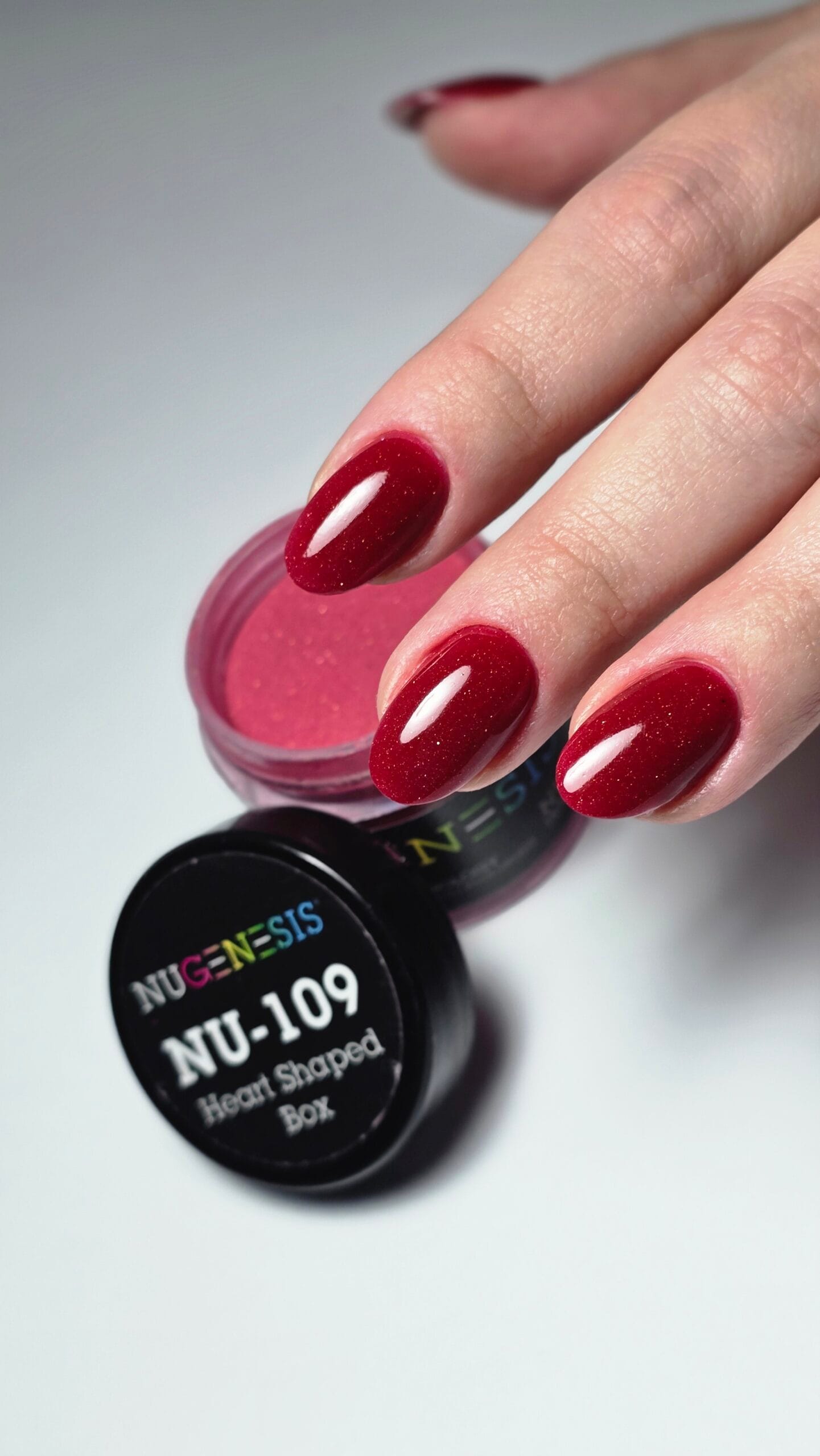 Kolor stworzony z myślą o manicure tytanowym. Klasyczna czerwień przełamana złotymi drobnymi, nadaje stylizacji klasy i elegancji.