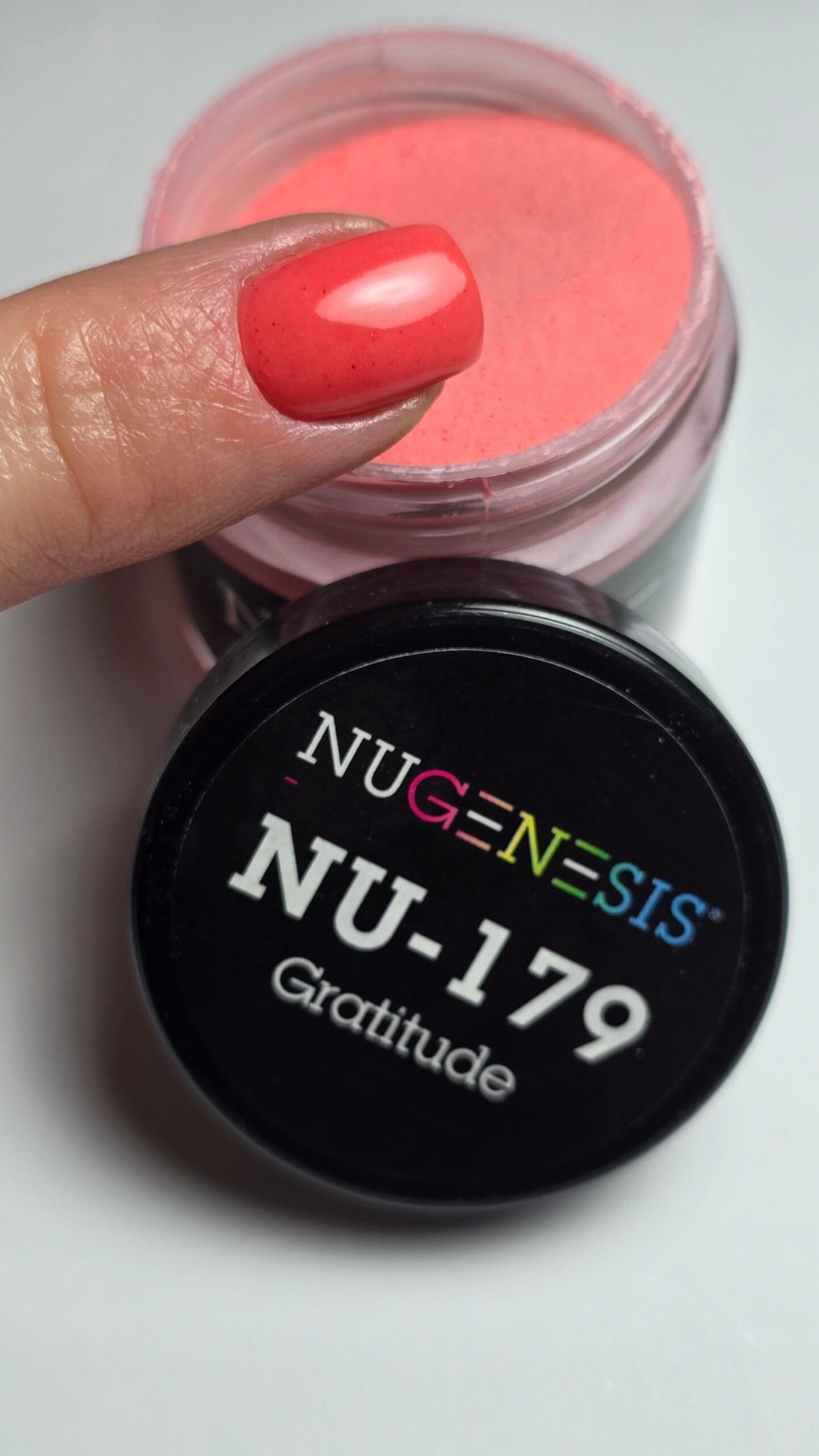 Nugenesis NU-179 Gratitude to energetyczny, koralowy odcień z subtelnymi drobinkami, który nadaje stylizacji świeżości i wyjątkowego charakteru. Ten intensywny kolor doskonale sprawdzi się w letnich stylizacjach paznokci, przyciągając uwagę i podkreślając opaleniznę dłoni.