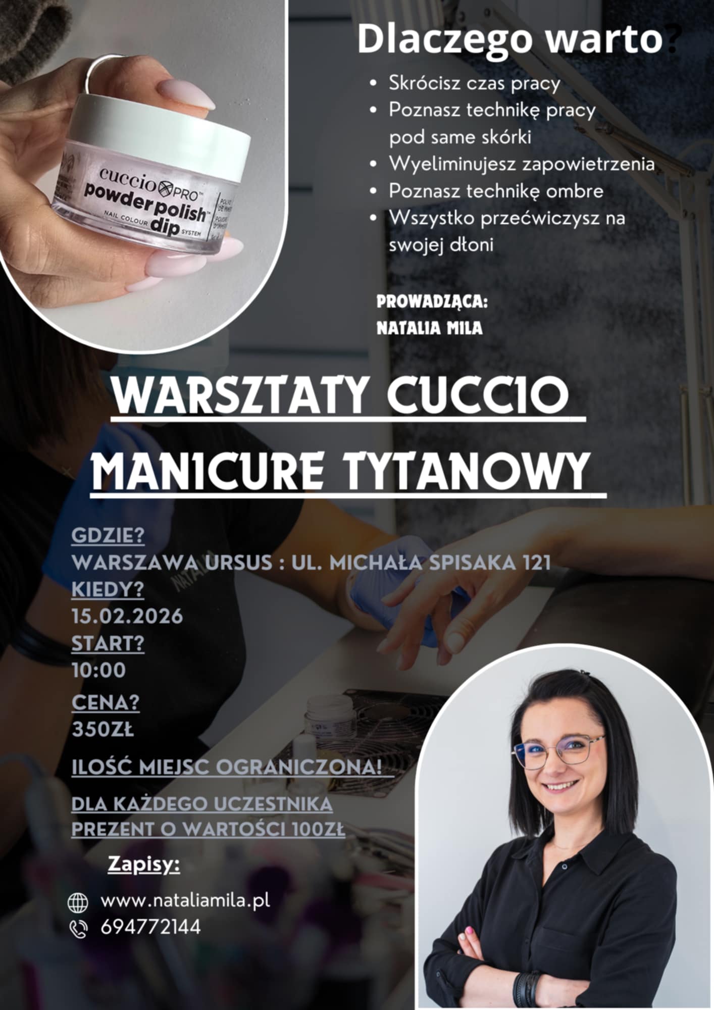 Warsztaty poprowadzę osobiście ja – Natalia Mila, doświadczona instruktorka, która krok po kroku przeprowadzi Cię przez cały proces manicure tytanowego.