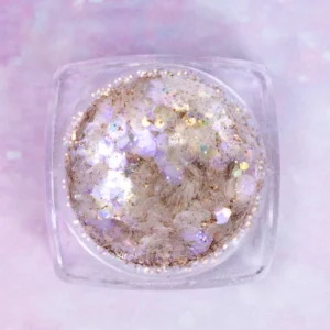 Serenity Effect – Venus to finezyjny pyłek do zdobień paznokci, łączący drobny brokat z delikatnymi, nieregularnymi płatkami dla magicznego, kosmicznego blasku. W zależności od kąta padania światła drobinki mienią się spektrem złotych i fioletowych tonów z subtelną nutą pomarańczu, przywołując niepowtarzalny efekt „księżycowego pyłu” na paznokciach.